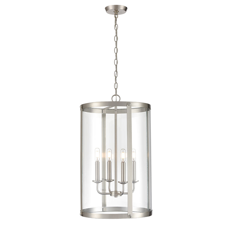 Sparkling clear glass cylinders set into a minimalist steel constructed framework provide abundant light in the Aydenn Collection of pendant lighting. Finished in quintessential matte black or gleaming brushed nickel, these definitive design statements are a bright addition to the foyer or hall.