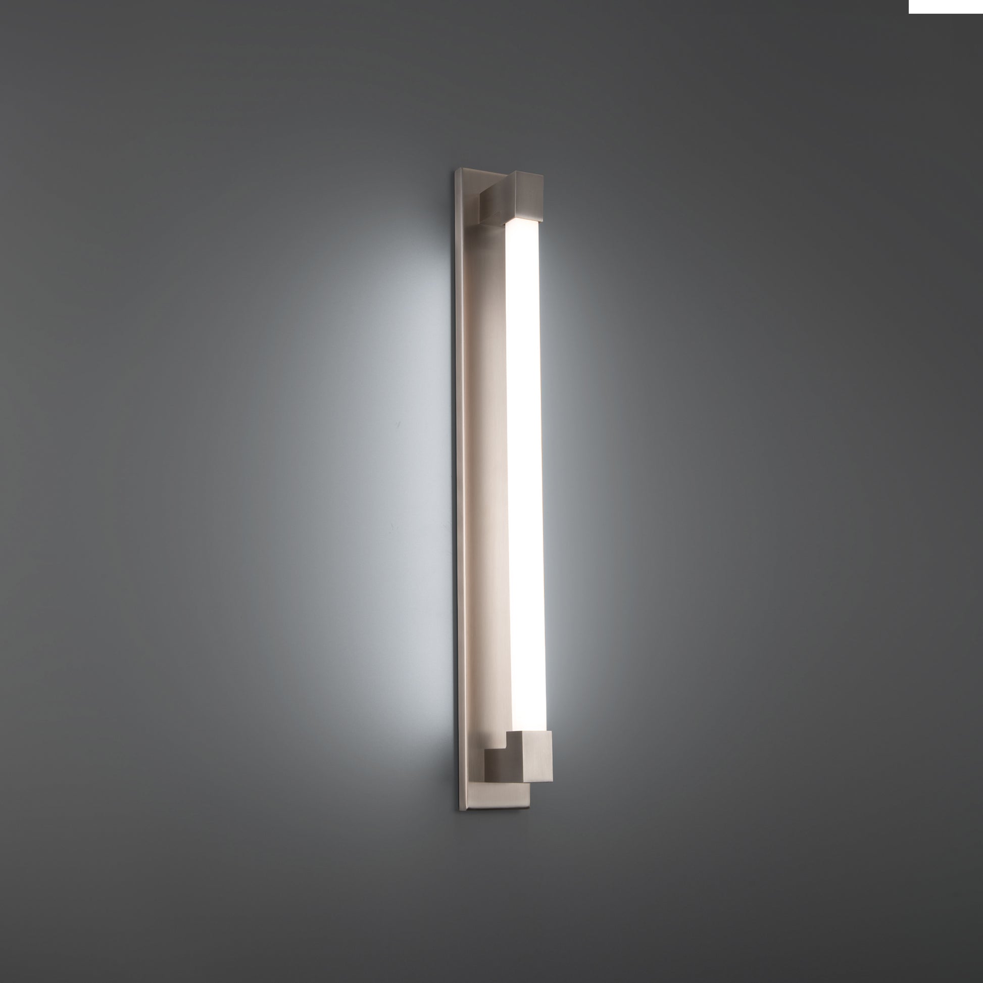A minimalist yet bold bath luminaire that deploys robust, flattering illumination above or alongside a vanity in residential, hospitality and commercial environments.