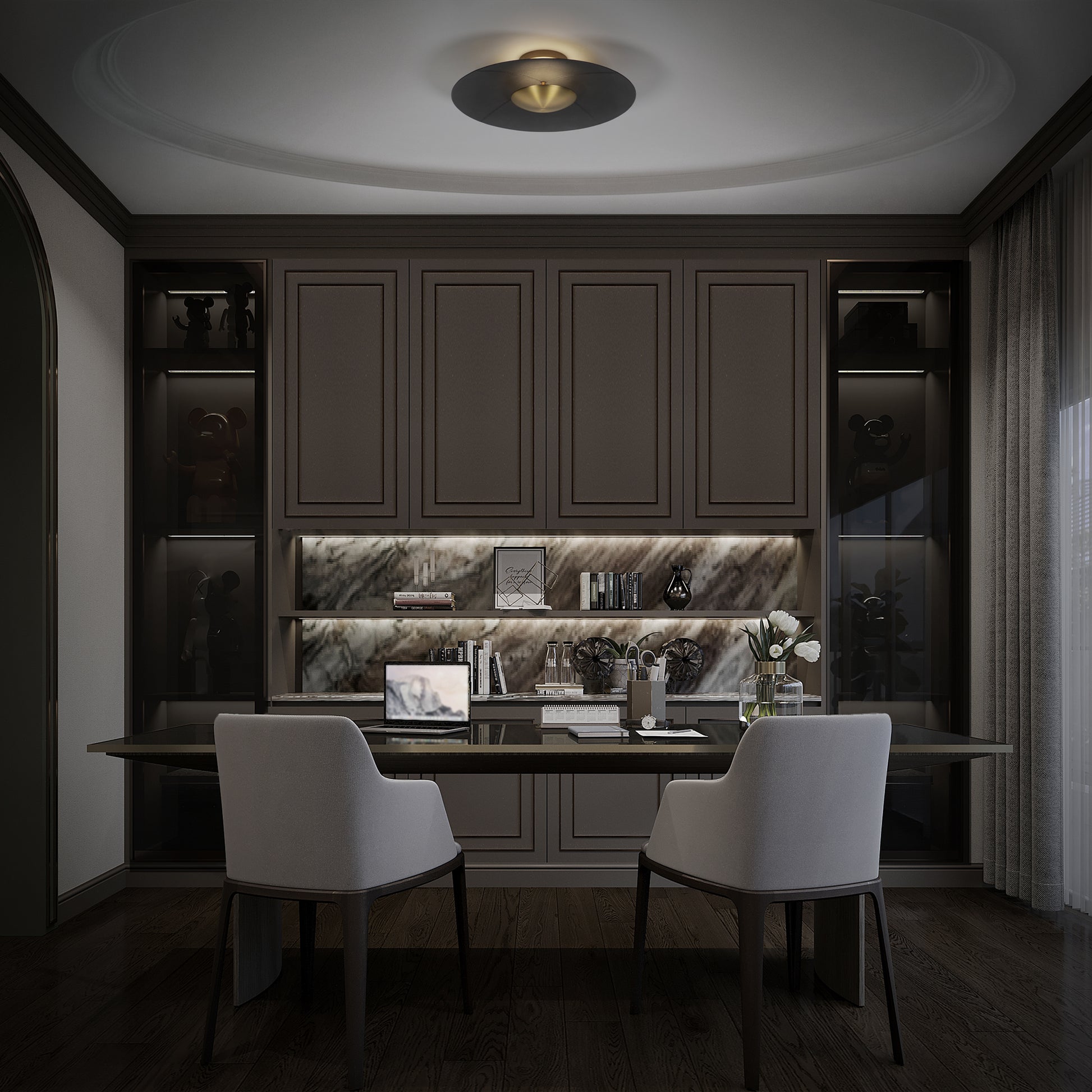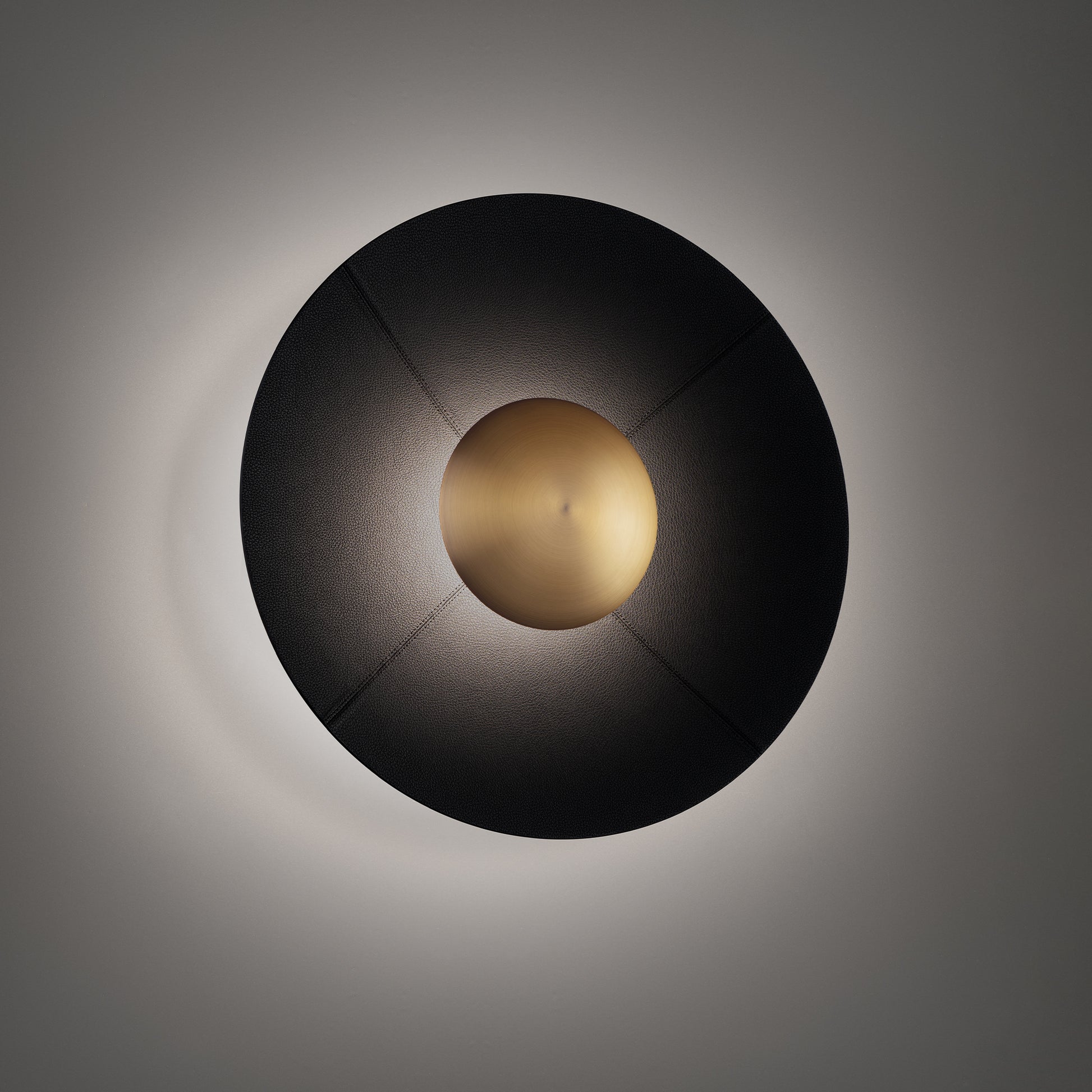 Tailored to a tee. A topstitched black disc suspended from a luminous circular frame offers ambient light from its concealed LED light source.