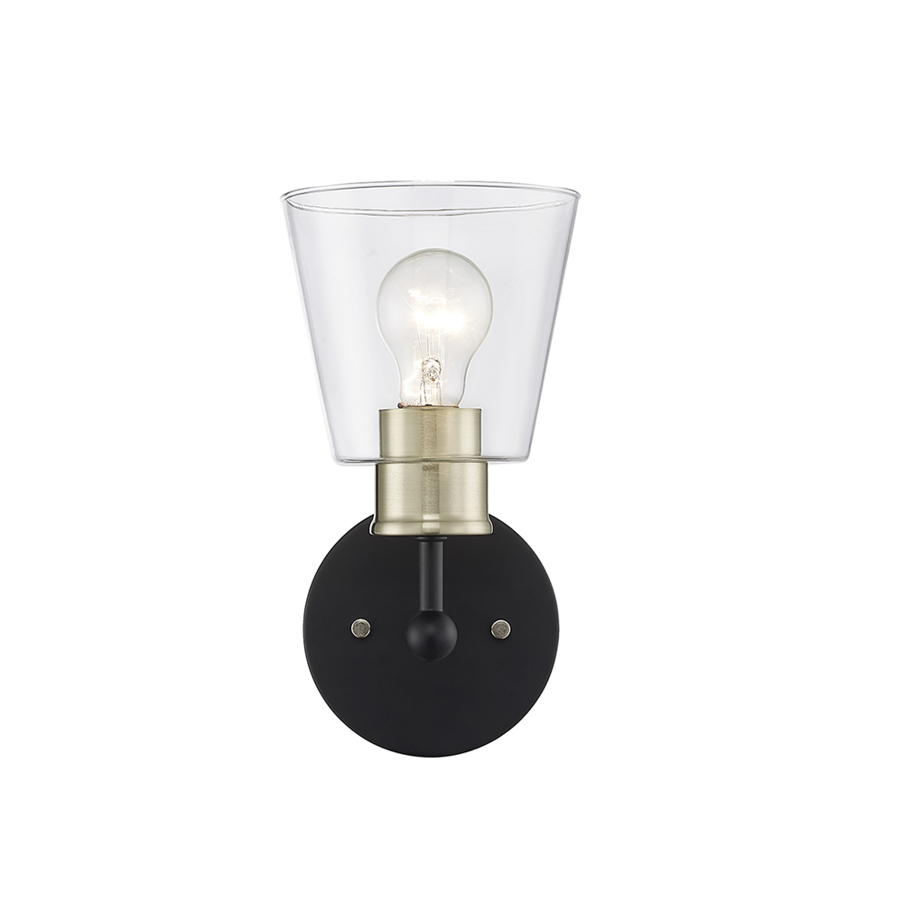 The Cameron Collection of vanity lighting blends matte black and modern gold finishes for an exquisite design effect. These structurally styled fixtures are a modern twist on classic industrial design and are complimented by flared, clear glass globes.