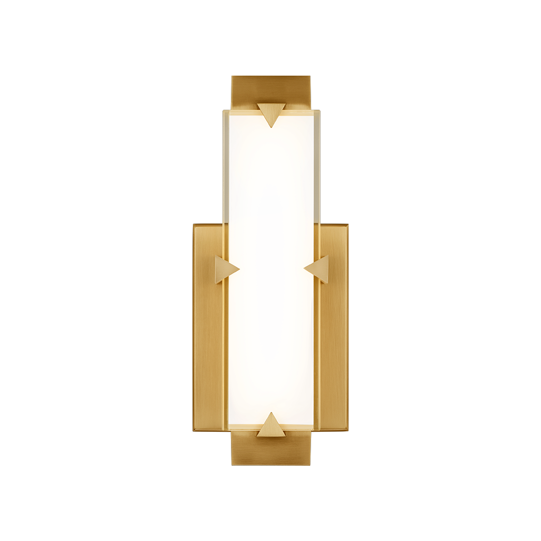 Modern Geometry. Rectilinear shapes intersect with triangles in the Carlisle wall sconce, creating a bold graphic frame that holds a color temperature selectable LED light bar. The sleek silhouette casts a warm glow into the surrounding space. Carlisle is offered in 11, 20, 27 and 37-inch sizes and is available in a choice of aged brass or brushed nickel finishes.