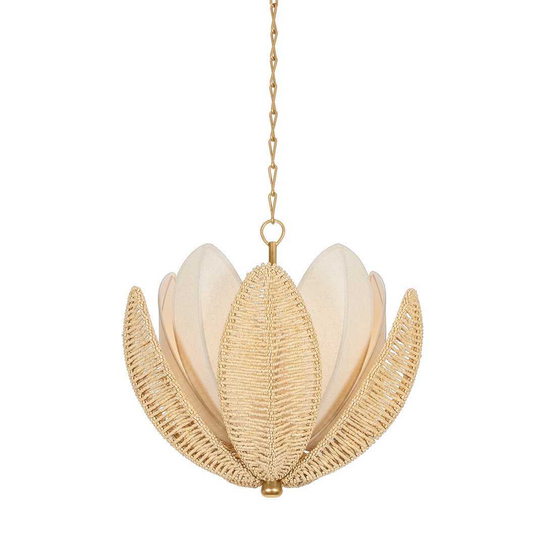 A celebration of nature, Costa Brava is the perfect blend of tropical texture and tonality. The outer shade of ‘petals’ is strung with coco shell beads, while the inner layer is woven from grained natural linen. Each petal features a center rib, creating a graceful curve to the shade. The Vintage Gold Leaf finial and canopy add a luxurious note. Available in two sizes, Costa Brava is an organic delight for any space.
