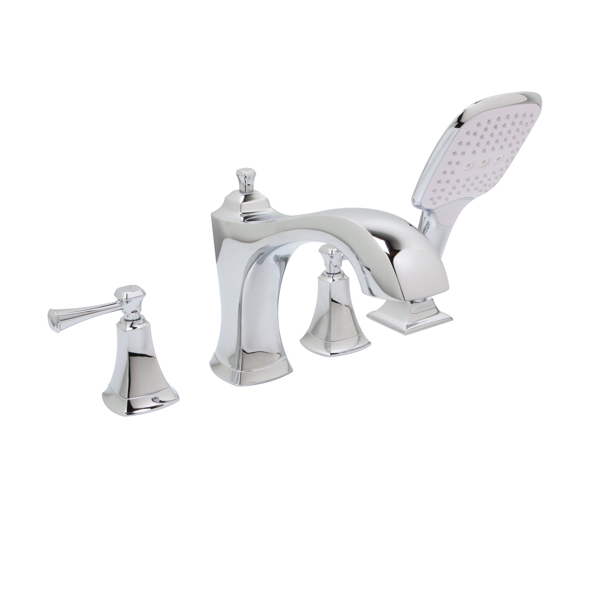 Transform your bathroom with the elegant Davenport roman tub filler faucet, available in a variety of finishes to match your decor. Its high-arc spout, refined lever handles, and pull-out hand shower offer endless design possibilities for a luxurious look. The faucet's sleek and sophisticated design will elevate the style in any bathroom.