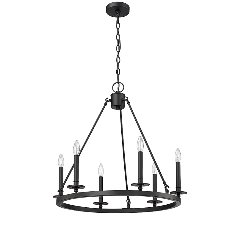 Unassuming, yet thoroughly striking, the Florence Collection celebrates simple candle-style luminaries and minimalistic lines in a nod to antique style lighting. The elegant wagon wheel design is steel construction that is further enhanced by the matte black finish.
