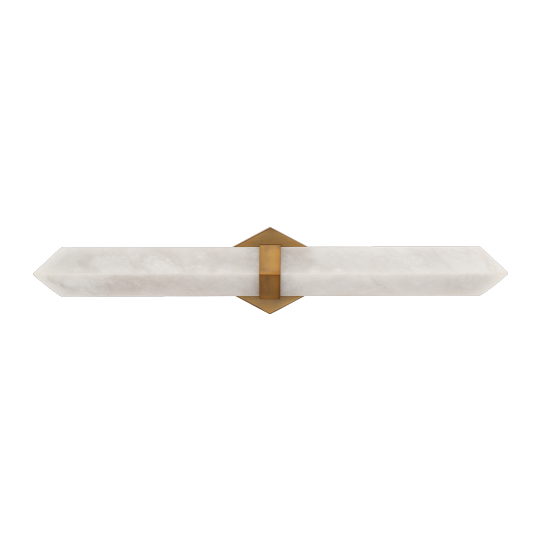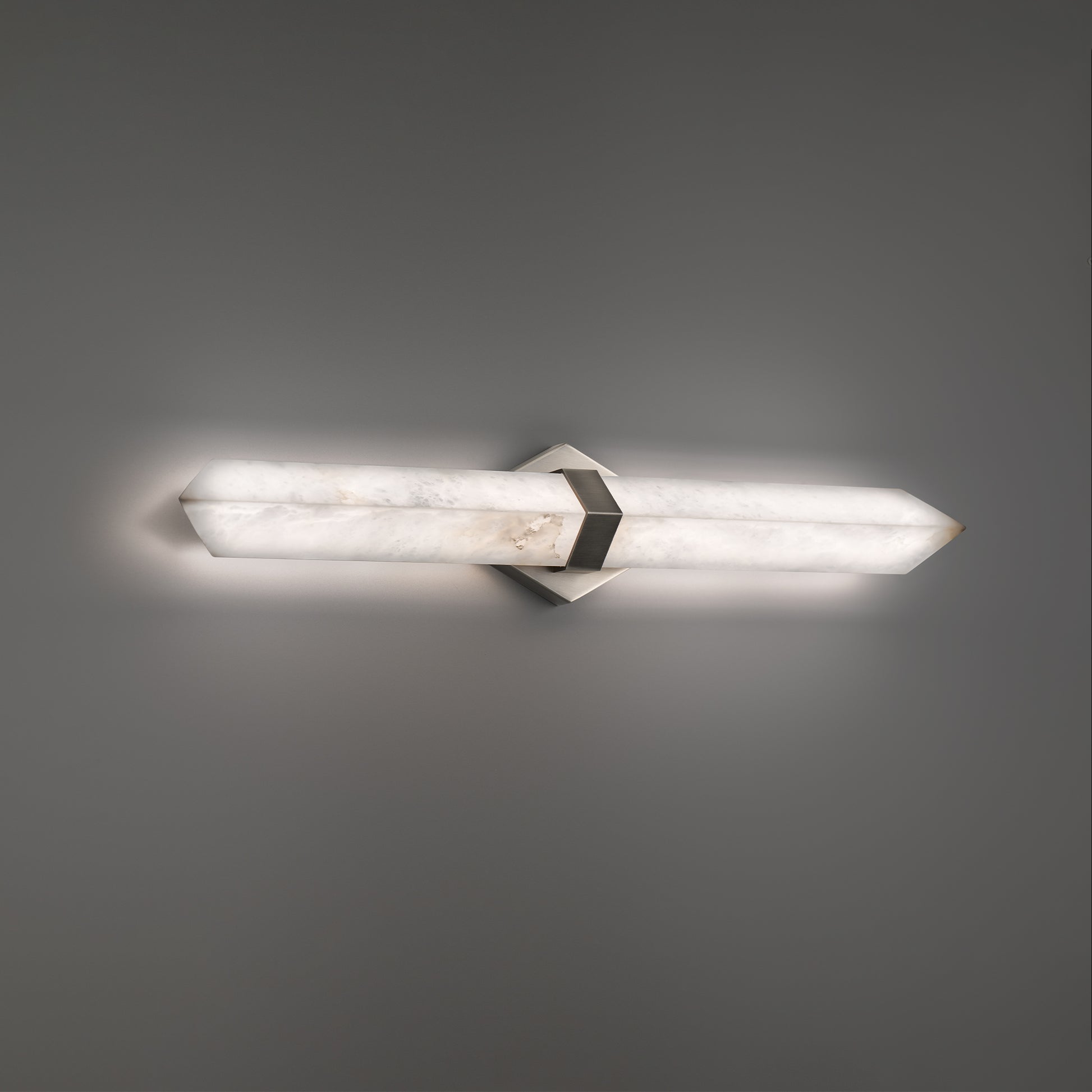 Light interaction. Lit from behind by hidden LEDs, an arrow of Spanish Alabaster embraced by a metallic band creates a luminous glow from natural veining and patterning inherent to this lovely stone.