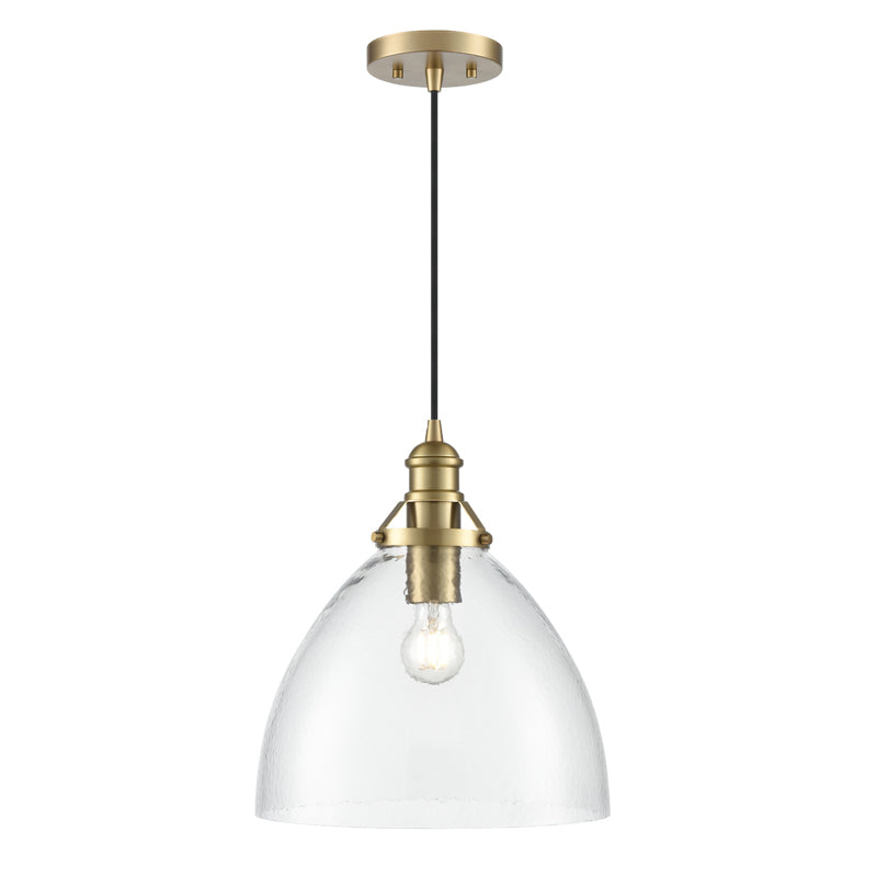 The Khrisa Family of pendant lighting combines modern styling with distinctive shades to create a lighting masterpiece perfect for the kitchen, dining area, or entryway. The stylized 1-light fixtures, finished in brushed nickel, polished nickel, vintage brass, or matte black, feature post-industrial styled hardware, creating a contemporary profile. The gorgeous, hammered glass shades are available in either a drum or bell-shaped silhouette and create a unique dappled lighting effect.
