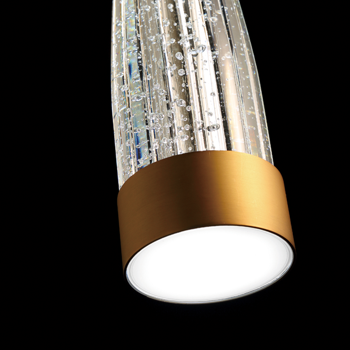 Aged brass finished hardware encases stunning seeded crystal glass that sparkles bright. A fluted grooved diffuser softens powerful LED illumination and fills the room with warm, even illumination. Install Mystic in multiples to make a dramatic design statement.