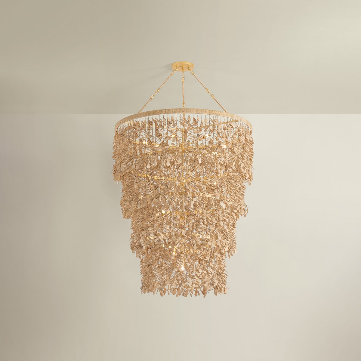 An ode to craftsmanship, the Naxos family is adorned with loosely draped strands of hand-carved coco shell pieces. The layering of smaller shell elements on each strand adds depth and volume, giving this family a sense of movement and a handcrafted beauty. Shaped like petals, the tonal pieces bring life to each design, including a 2-light wall sconce, a chandelier in three sizes, and an island light.