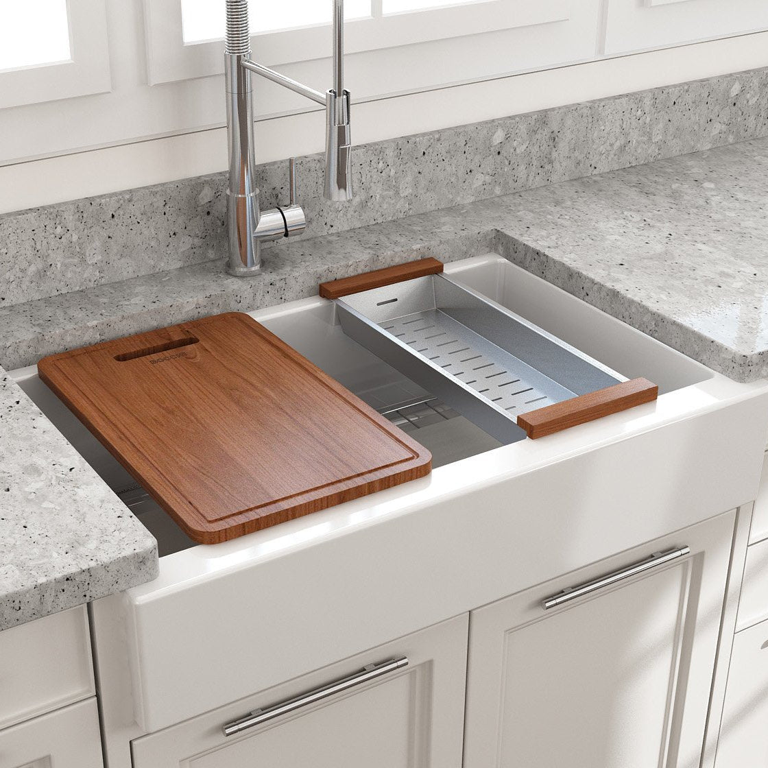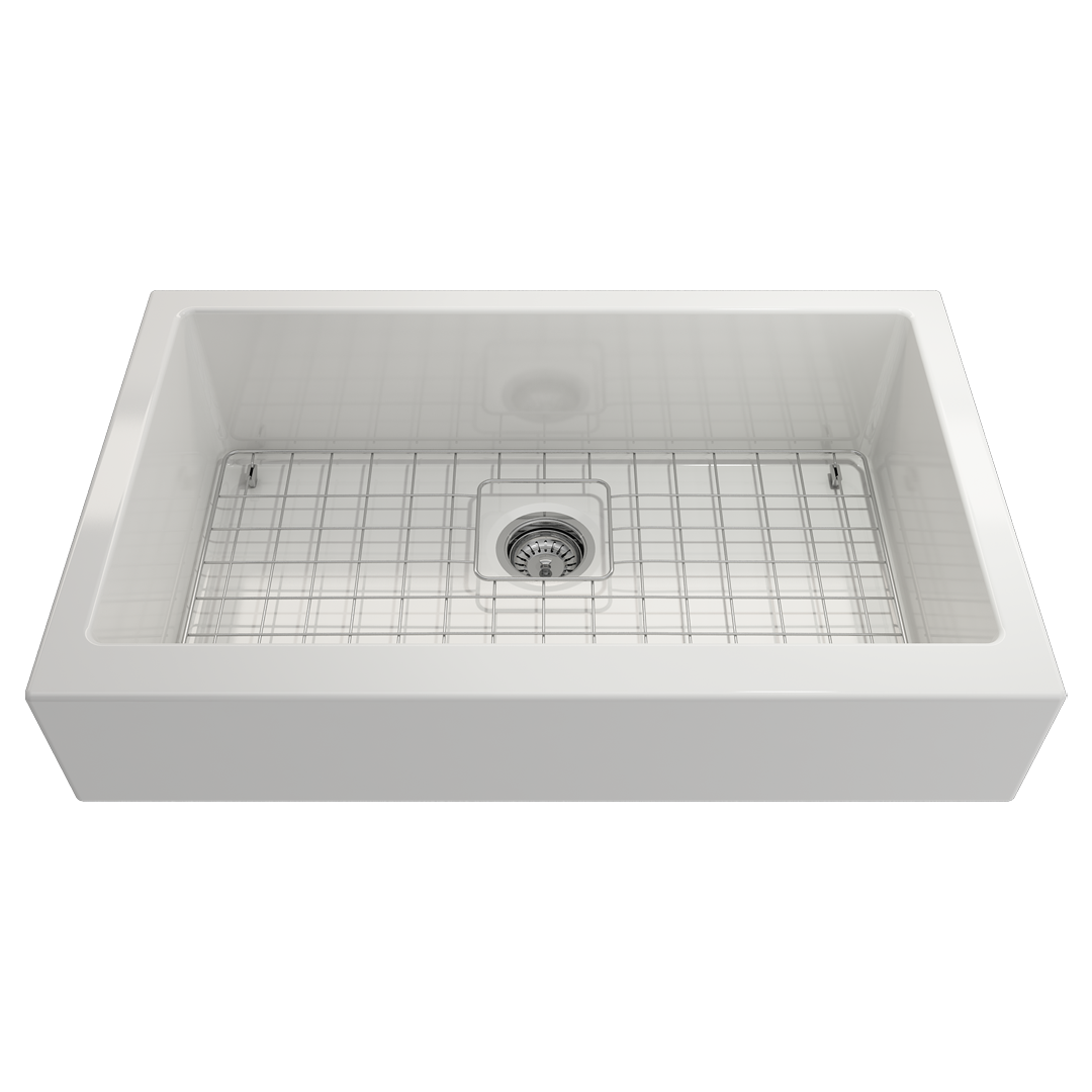 BOCCHI Farmhouse Sinks bring back the ultimate material to your kitchen. Fireclay, a 100% natural organic and recyclable material used by craftsman for centuries to create timeless appliances has now returned to your kitchen. With the firing in our kilns up to 2000°F temperatures, Fireclay becomes the most durable material used in today's kitchens. Thus, dealing with extreme heat coming from pots and pans is definitely not a problem. Due to their special glaze coating fused with the fireclay body, our sinks have a non-porous, uniform, scratch and stain resistant surface. With its protective bottom grid and distinctive looks, BOCCHI Farmhouse Sinks are truly crafted to match your design and functional desires. Features: