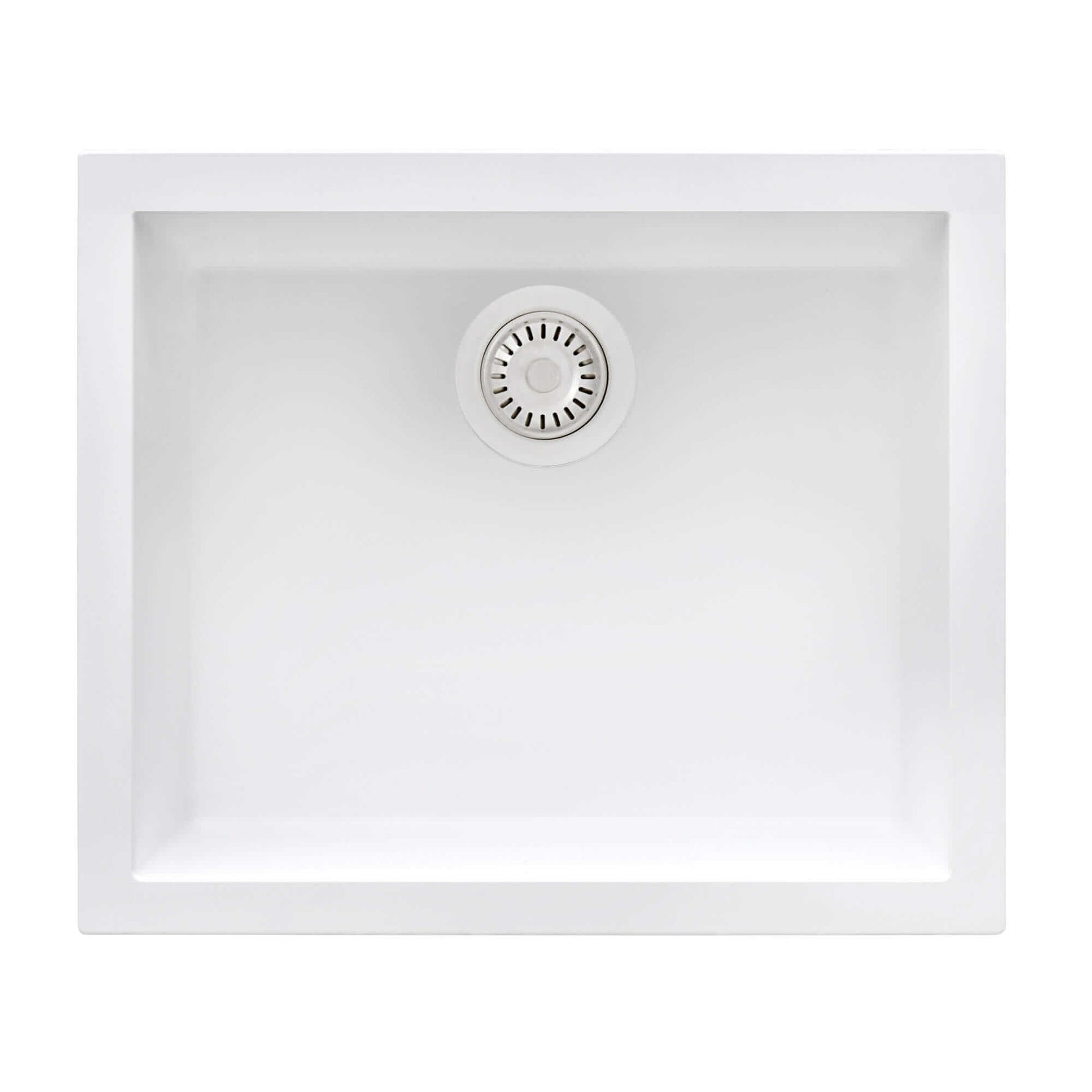 • INCLUDED IN BOX: Sink, matching white strainer drain assembly, cutout template, mounting clips, installation guide.