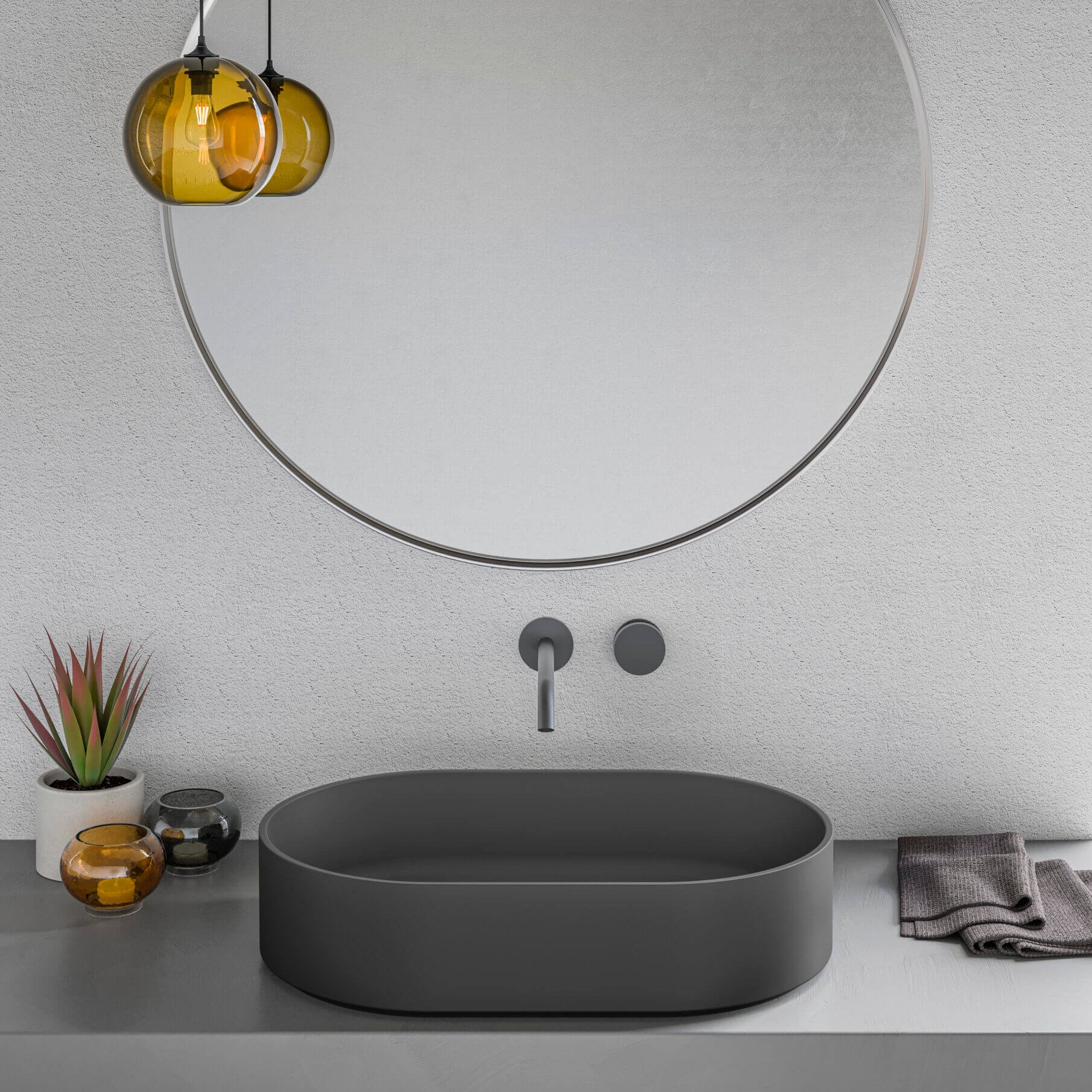 Ruvati delivers a new shade of modernity with the release of their Omnia bathroom sink collection constructed of epiStone material. Made in Italy, epiStone is developed using state-of-the-art technology to achieve exceptional strength and beauty for the bathroom space. It is composed of 70% crushed minerals and natural stone bonded with a proprietary resin that gives the material its strength and durability. Naturally beautiful with a look similar to real stone, the epiStone material presents a luxurious satin finish that is silky to the touch. EpiStone bathroom sinks from Ruvati feature a modern vessel shape and bold color options that are bound to draw the eye. The matte black and stylish white epiStone sinks offer a twist on tradition and appear much sleeker and more contemporary than traditional porcelain bathroom sinks. Looking for something even more unique? Ruvati epiStone sinks are also available in eye-catching colors like a light pink called Sedona Clay, Avocado Lime Green, and Pacific Blue. We all could use a pop of color, and these luxurious statement pieces are built to inspire your bathroom renovation. MADE IN ITALY: epiStone solid surface products from Ruvati are meticulously crafted by skilled Italian artisans. EPISTONE: High-quality innovative composite material that produces a hard surface and requires little maintenance. ENGINEERED STONE: Composed of 70% crushed natural stone and minerals bonded with a proprietary resin under intense pressure to create a solid surface that is extremely strong and durable. SATIN MATTE POWDER FINISH: Natural beauty similar to stone and silky to the touch. OVAL SHAPE: For maximum comfort and easy cleaning. VESSEL SINK: Designed for installation on top of countertop - sink sits securely on top of countertop (no mounting ring required). NOISE-FREE: Thick solid construction makes the tub naturally sound-absorbing. EXTERIOR DIMENSIONS: 22-3/4 (wide) x 14-5/8 (front-to-back)INTERIOR BOWL DIMENSIONS: 21-5/8 (wide) x 13-3/8 (front-to-back) x 5 (bowl depth)MATCHING POP-UP DRAIN INCLUDED: Standard 1-7/8 opening. INCLUDED IN BOX: Sink and matching drain. Ruvati USA Limited Lifetime Warranty