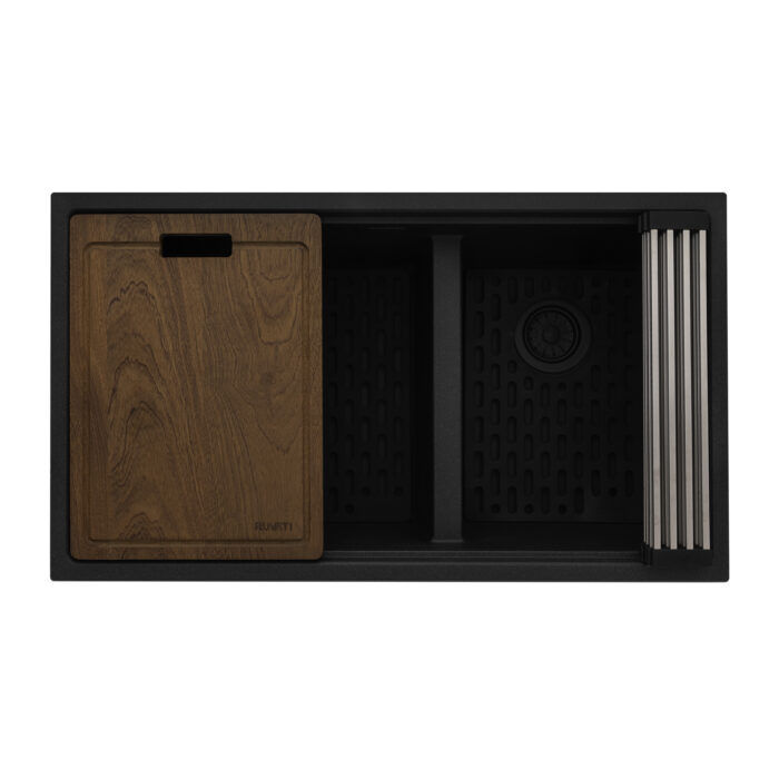 • INCLUDED IN BOX: Sink, solid hardwood cutting board, foldable drying rack, silicone rinse grid, matching strainer drain assembly, cutout template, mounting clips, installation guide.