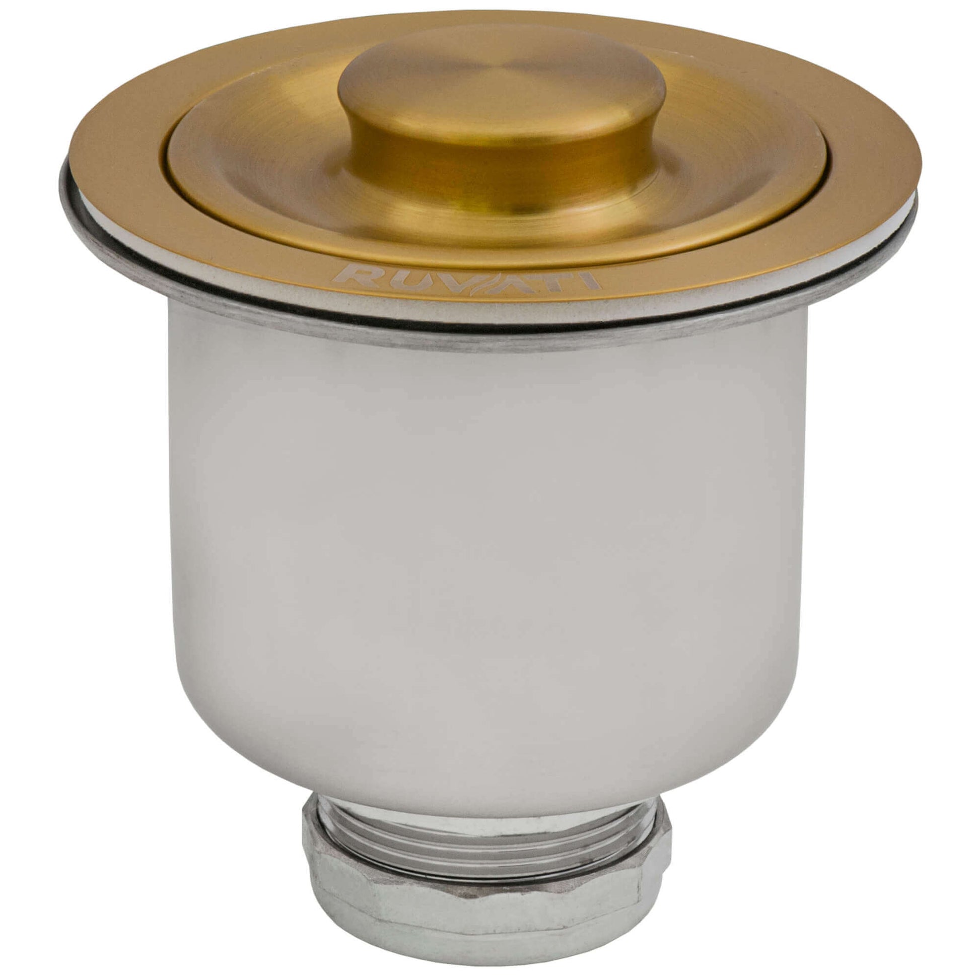 This premium kitchen sink strainer drain assembly from Ruvati features an all metal construction for extreme durability and strength. The extra deep basket traps all food particles and waste, while allowing water to flow through easily. It includes a convenient handle for easy cleaning: simply lift the basket and empty it into the trash. Also included is a matching stopper: push it in on top to plug the drain when you want to fill your sink. ALL-METAL CONSTRUCTION: No plastic parts. Fully made of T-304 stainless steel and brass for long lasting durability and rust resistance. 3. 5 DRAIN OPENING: Will fit any standard kitchen sink drain opening. BRUSHED GOLD / SATIN BRASS FINISH: Stainless steel construction with nano-PVD finish to match your gold color or satin brass sink or faucet. NOTE: This is a gold finish that matches Ruvati gold stainless steel sinks. It may not match the gold finish of faucets and other fixtures. REMOVABLE DEEP BASKET TRAPS WASTE: Helps trap large food particles while allowing water to flow through freely. Simply lift the basket and empty the waste into your trash can. PUSH-IN STOPPER CAP WITH RUBBER GASKET: Simply push down the lid to plug your drain when you want to fill your sink with water. One (1) Year Limited Warranty - Ruvati USA