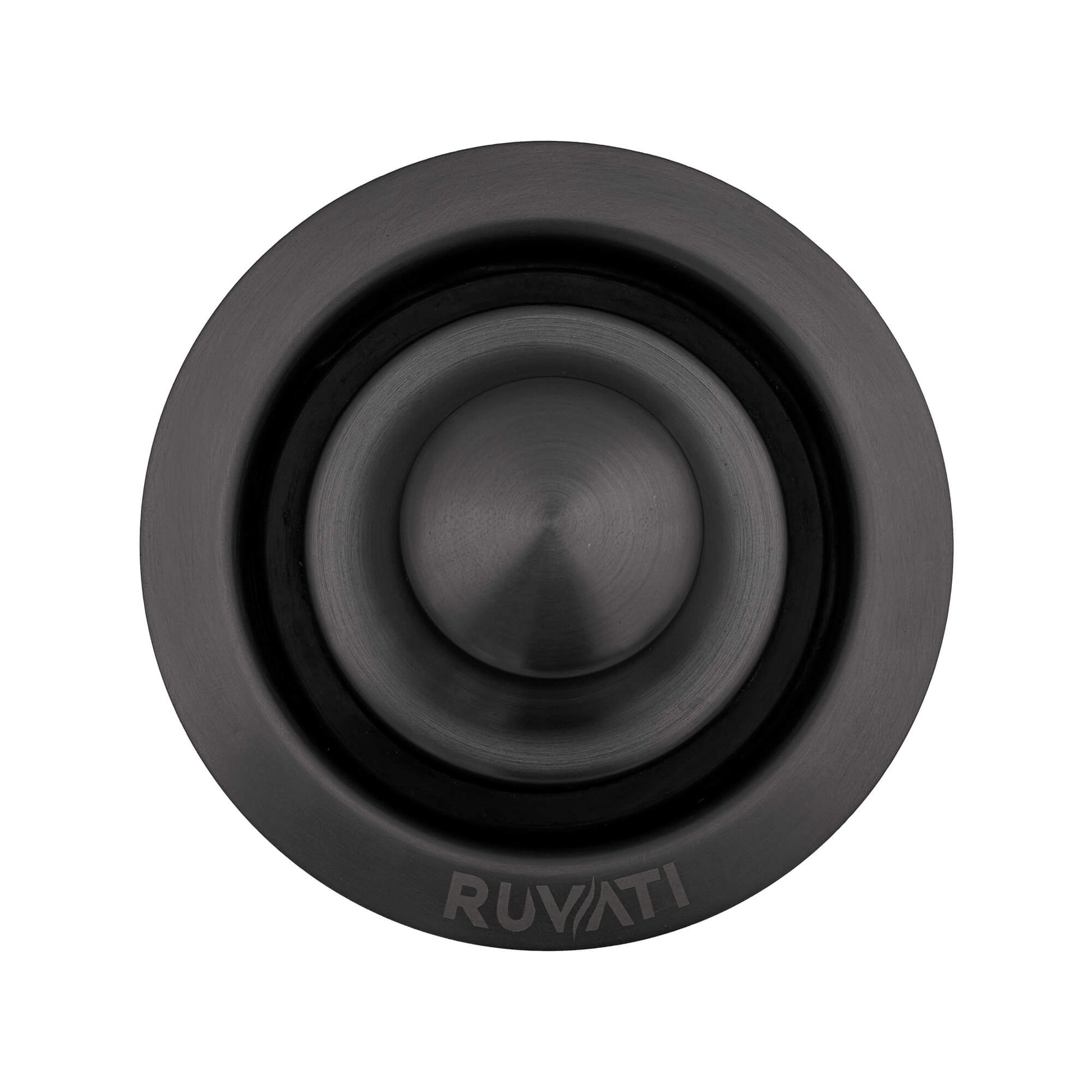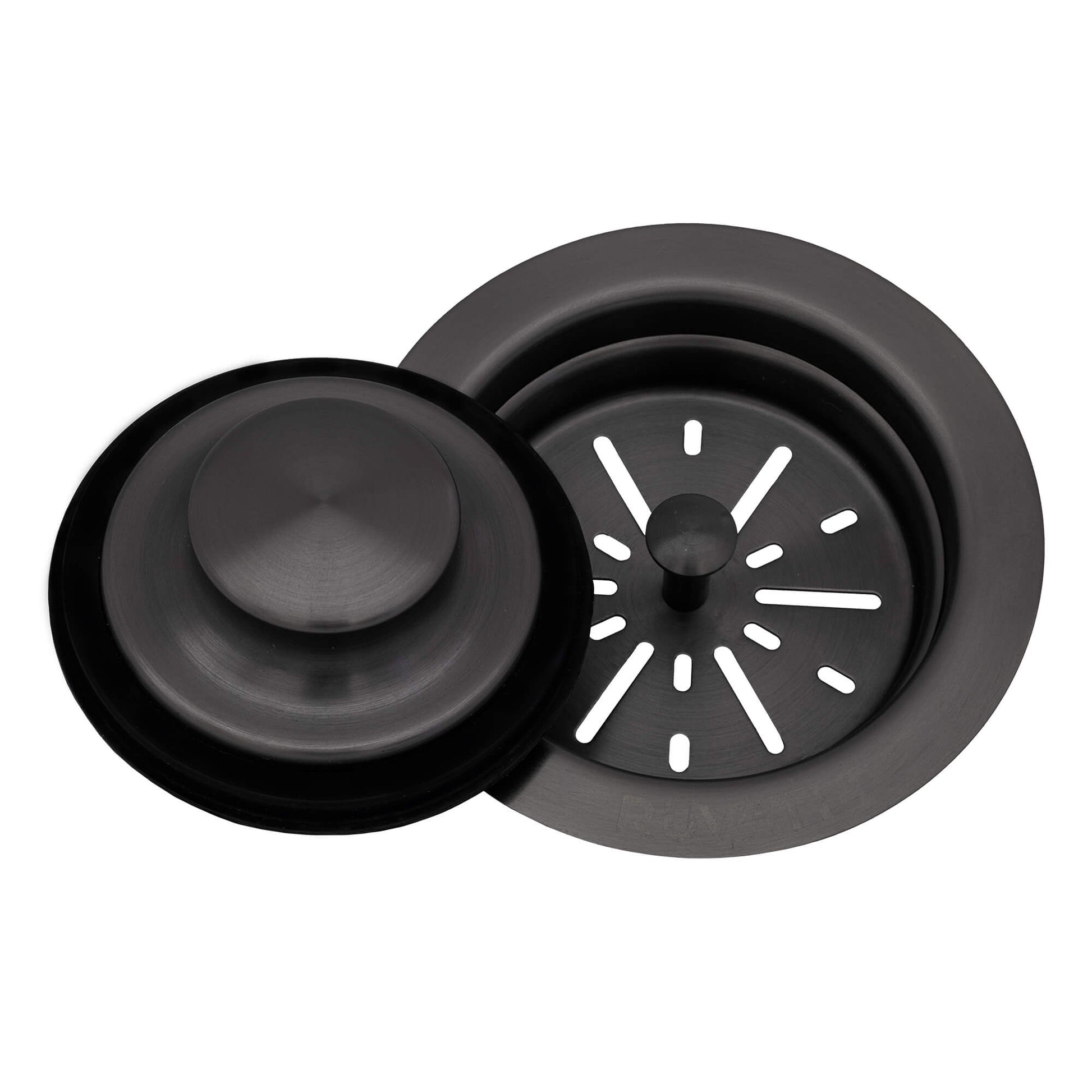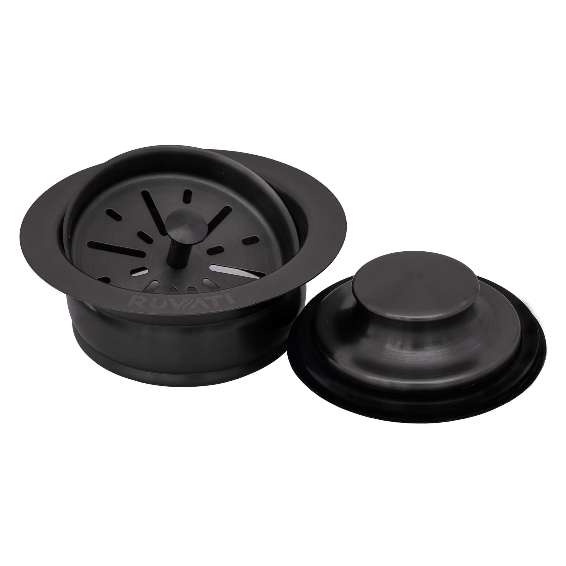 This standard height disposal flange with stopper from Ruvati fits standard stainless steel sinks and granite composite sinks (up to 1/2 thickness). It includes a matching stopper lid that can be used to plug your drain when you want to fill your sink with water. What makes this flange truly unique is the included basket strainer that sits inside the flange. Now you dont have to worry about metal teaspoons falling into and damaging your disposal, or large food particles going through and clogging your drains. The strainer includes a convenient handle for easy cleaning: simply lift the basket and empty it into the trash. The flange fits all Insinkerator brand disposal units. Upgrade your disposal and enhance the overall beauty of your sink with this basket strainer disposal flange from Ruvati. GUNMETAL BLACK FINISH: Stainless steel construction with nano-PVD finish to match your black stainless steel sink. NOTE: This is NOT a pure black color; its a gunmetal black finish that matches Ruvati gunmetal black stainless steel sinks. STANDARD HEIGHT: fits stainless steel and granite composite sinks. For thicker fireclay sinks, use our Extended Deep flange (Model # RVA1052) instead. FITS STANDARD 3. 5 DRAIN OPENING: Garbage disposal flange compatible with all Insinkerator model garbage disposals. REMOVABLE STRAINER TRAPS WASTE: Helps trap large food debris and protect your disposal and drain. PREMIUM STAINLESS STEEL: Brushed finish - made of thick 304-grade stainless steel for long lasting durability and strength. One (1) Year Limited Warranty - Ruvati USA