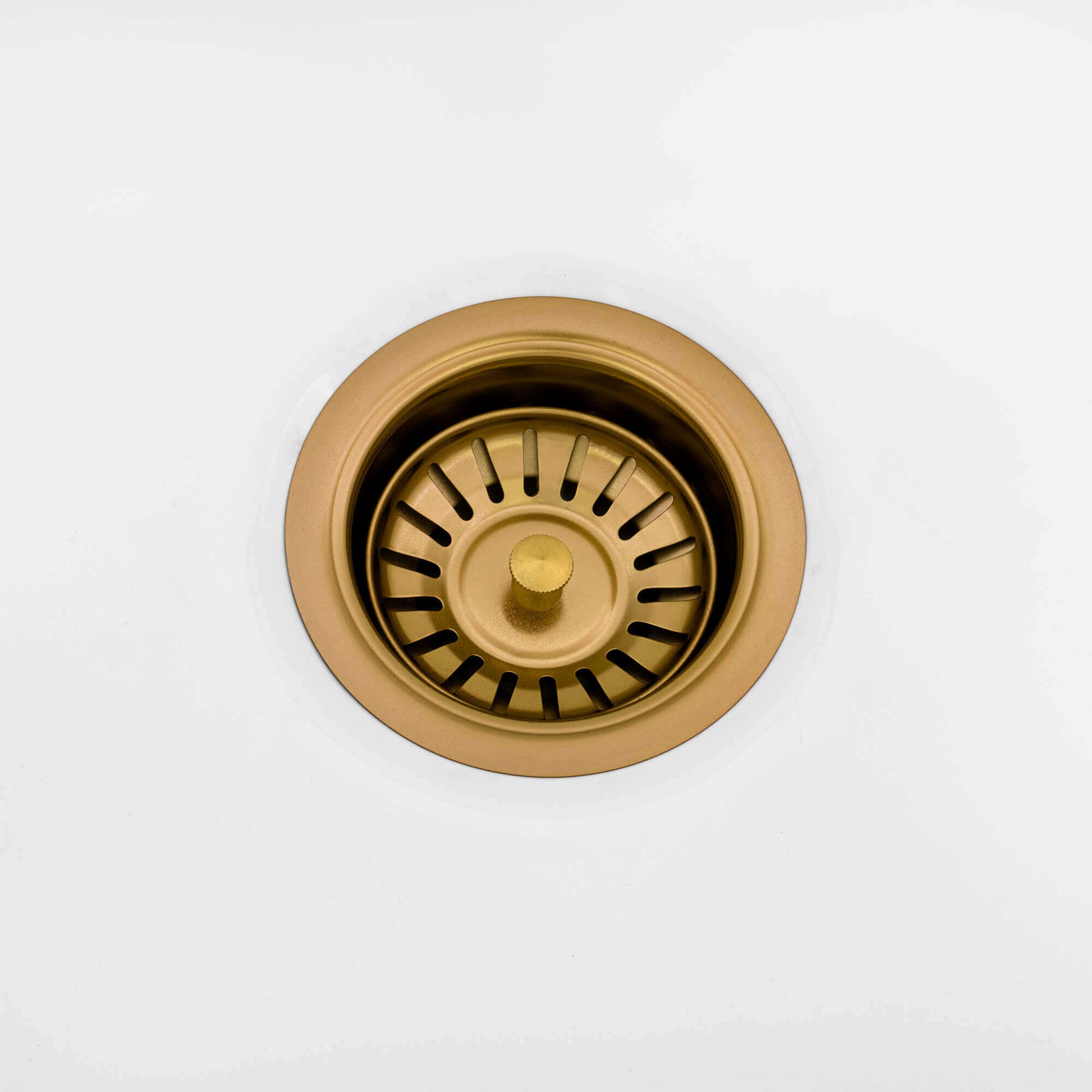 This kitchen sink basket strainer from Ruvati sits inside the flange. Now you dont have to worry about metal teaspoons falling into and damaging your disposal, or large food particles going through and clogging your drains. The strainer includes a convenient handle for easy cleaning: simply lift the basket and empty it into the trash. 3. 5 DRAIN OPENING: Will fit any standard drain openings. BRUSHED GOLD / SATIN BRASS FINISH: Stainless steel construction with nano-PVD finish to match your gold color or satin brass sink or faucet. REMOVABLE STRAINER TRAPS WASTE: Helps trap large food debris and protect your disposal and drain. PUSH-IN STOPPER CAP WITH GASKET: Simply push down the basket to plug your drain when you want to fill your sink with water. One (1) Year Limited Warranty - Ruvati USA