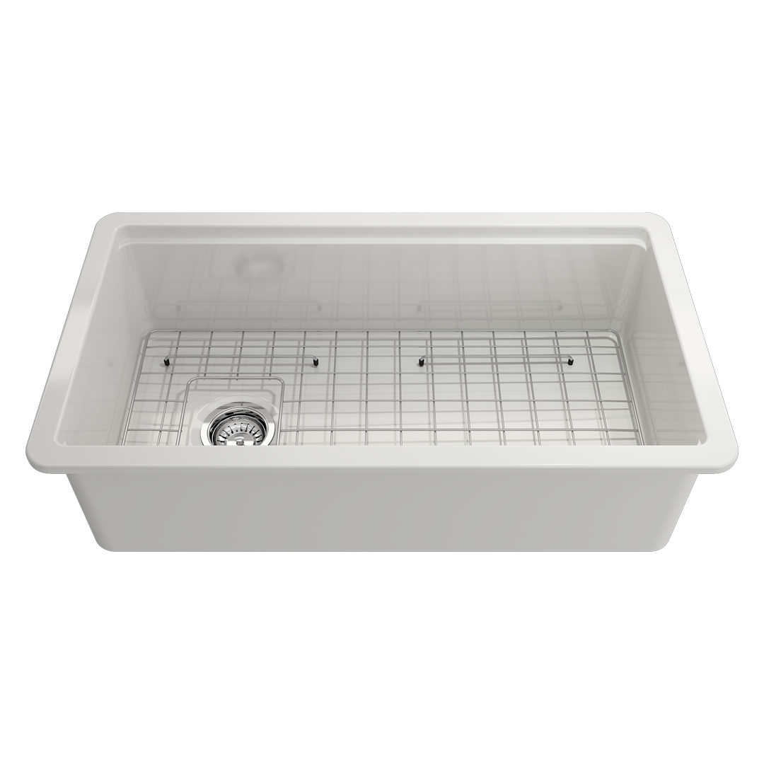 BOCCHI Sinks bring back the ultimate material to your kitchen. Fireclay, a 100% natural organic and recyclable material used by craftsman for centuries to create timeless appliances has now returned to your kitchen. With the firing in our kilns up to 2000°F temperatures, Fireclay becomes the most durable material used in today's kitchens. Thus, dealing with extreme heat coming from pots and pans is definitely not a problem. Due to their special glaze coating fused with the fireclay body, our sinks have a non-porous, uniform, scratch and stain resistant surface. With its protective bottom grid and distinctive looks, BOCCHI Sinks are truly crafted to match your design and functional desires. Uniquely crafted for to allow multiple installation types. May be installed as an undermount, drop-in, or with an 11/16” semi-reveal that creates a workstation sink ledge suitable for use with select accessories, including: cutting board, colanders, and roller mat. Note, the roller mat and expandable colander may also be used with the undermount and drop-in installations.Features: