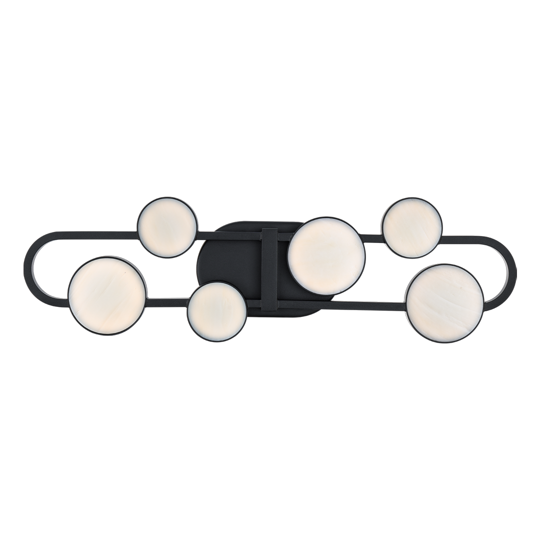 Ovals and rings intertwine in a striking geometric composition of clean, elegant lines, creating the Tableau wall sconce. Meticulously cut art glass shades are beautifully illuminated from the side by hidden, color temperature selectable LEDs, casting shimmering circles of light. This Deco-inspired wall sconce is finished in black and offers versatile installation options, allowing it to be mounted vertically or horizontally.