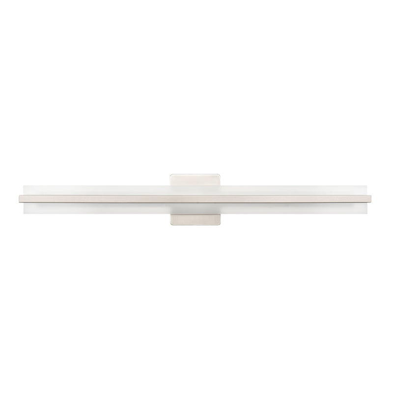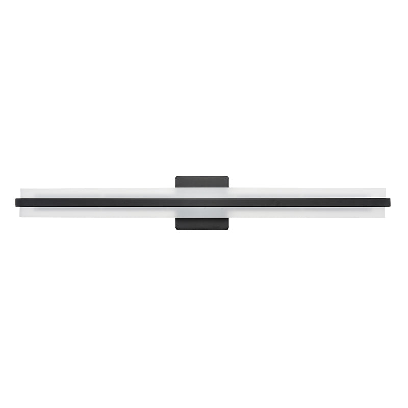 A sleek linear metal base bisects an opal white glass shade, creating a dramatic profile for the Troy Collection of vanity lighting. The fixtures are finished in matte black or brushed nickel, making a bold, ultra-modern, artistic, and practical design statement. Lit by energy-efficient LED, these futuristic pieces are designed for vertical or horizontal installation.